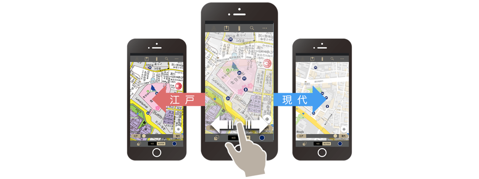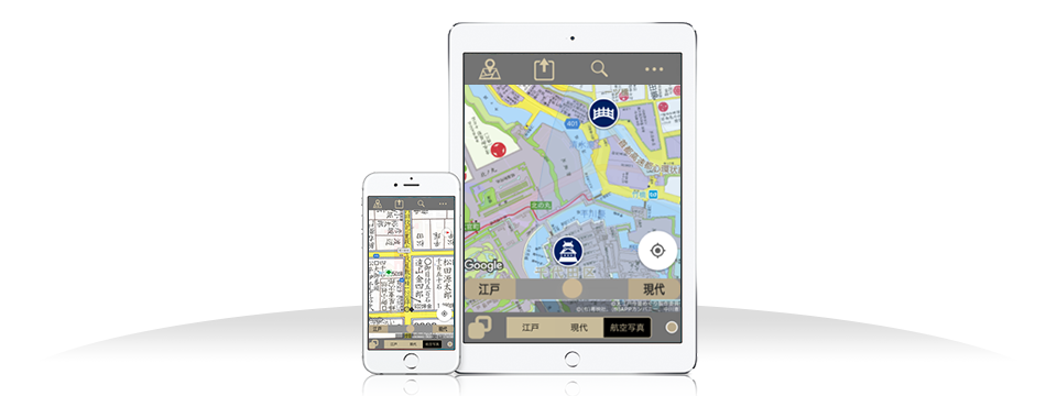 現代図と重なる地図アプリ。